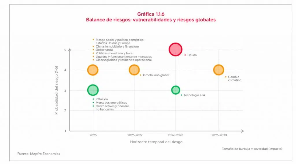 Mapfre Economics, el Servicio de Estudios de Mapfre, elabora un mapa de riesgos para su informe Panorama económico y sectorial 2026, en el que destaca todos aquellos aspectos que pueden afectar el desempeño de la economía global, y en el que la deuda ha ido ganando protagonismo.