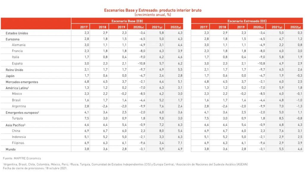 Para la eurozona, Mapfre Economics ha aumentado la previsión de crecimiento para este año en cinco décimas, hasta el 5%, gracias al mejor comportamiento registrado tanto en el segundo como el tercer trimestre. Sin embargo, rebaja las del ejercicio que viene en dos décimas, al 4,3%. “Con las altas tasas de vacunación en Europa, creemos que los niveles de restricciones seguirán reduciéndose, y esperamos que el despliegue de los fondos NGEU tengan un efecto multiplicador y duradero en la economía mediante reformas estructurales e inversión en infraestructura”, explican.