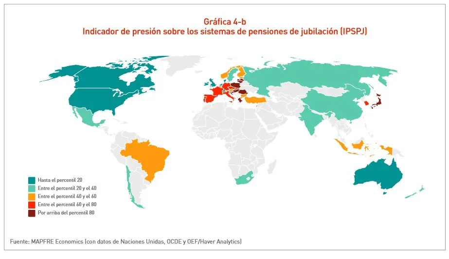 Este fenómeno se deja notar en muchos aspectos de la organización social y económica. Lamentablemente, uno de los más afectados es el sistema de pensiones. “La longevidad, junto con la materialización de otros riesgos de naturaleza económica y financiera, ha venido afectando de manera significativa al gasto en pensiones, implicando la necesidad de seguir avanzando en el ajuste de esos sistemas a fin de hacerlos sostenibles en el largo plazo y, de esa forma, preservar uno de los pilares más importantes de la organización social de nuestros días”, explica el informe Sistemas de pensiones de Mapfre Economics.