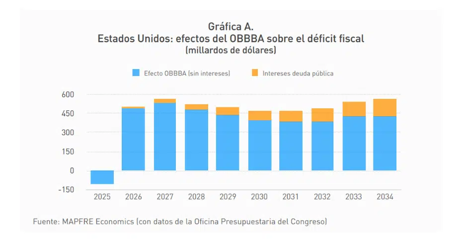 Además, Mapfre Economics señala que existe el riesgo que las medidas temporales de la OBBBA (como las deducciones ampliadas) se renueven en futuros periodos electorales, propiciando aún más el deterioro fiscal. En los mercados financieros, el OBBBA ha elevado las expectativas de emisión neta de deuda y ha hecho subir los rendimientos de los bonos del Tesoro. En este sentido, la carga de intereses, ya superior al gasto en defensa, «pone en duda la sostenibilidad del endeudamiento», en tanto que las medidas para limitar la exposición de los bancos comerciales a la deuda pública (la cual se sitúa en alrededor del 20 % de su total de activos) han sido limitadas, y «persiste el riesgo de que los inversores extranjeros diversifiquen fuera del dólar», pese a la eliminación de penalizaciones fiscales.
