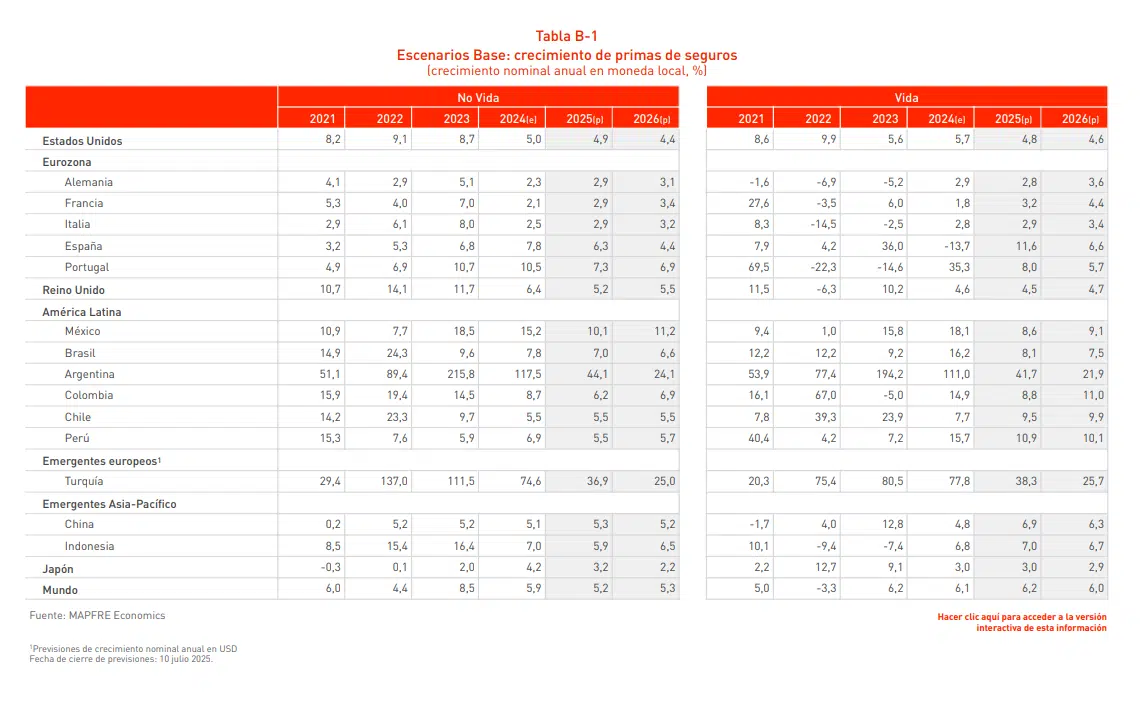 Mapfre Economics insiste en que el desempeño de las principales economías en los próximos trimestres será determinante para la evolución del mercado asegurador, condicionando su crecimiento y capacidad de adaptación a un entorno económico global complejo. En ese sentido, el Servicio de Estudios de Mapfre estima un crecimiento para la economía mundial del 2,9 % este año, dos décimas más respecto a las previsiones de hace unos meses, y el 3 % el que viene, con una inflación que se situará en el 3,4 % y en el 2,9 %, respectivamente.