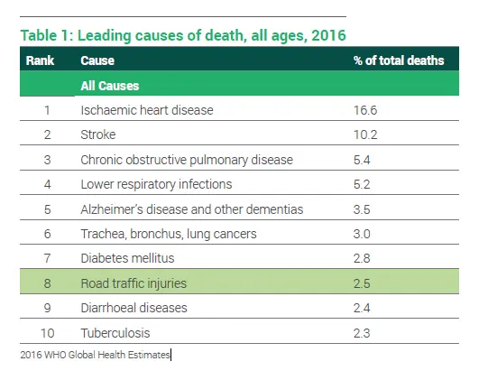 Distracciones al volante (28%), consumo de alcohol (24%) y exceso de velocidad (23%) son algunas de las causas más frecuentes por las que los españoles pierden la vida al volante. Los accidentes de tráfico siguen siendo la 8ª causa de muerte en el mundo, la primera para personas de entre 5 y 29 años, cobrándose la vida de más de 1.35 millones de personas en 2016.