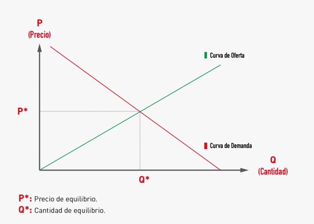 El punto de intersección entre la oferta y la demanda se denomina equilibrio de precios: un bien o servicio particular se entregará al mercado (Q*) a un precio particular (P*). Desde ese punto de equilibrio inicial, existen cuatro escenarios posibles: