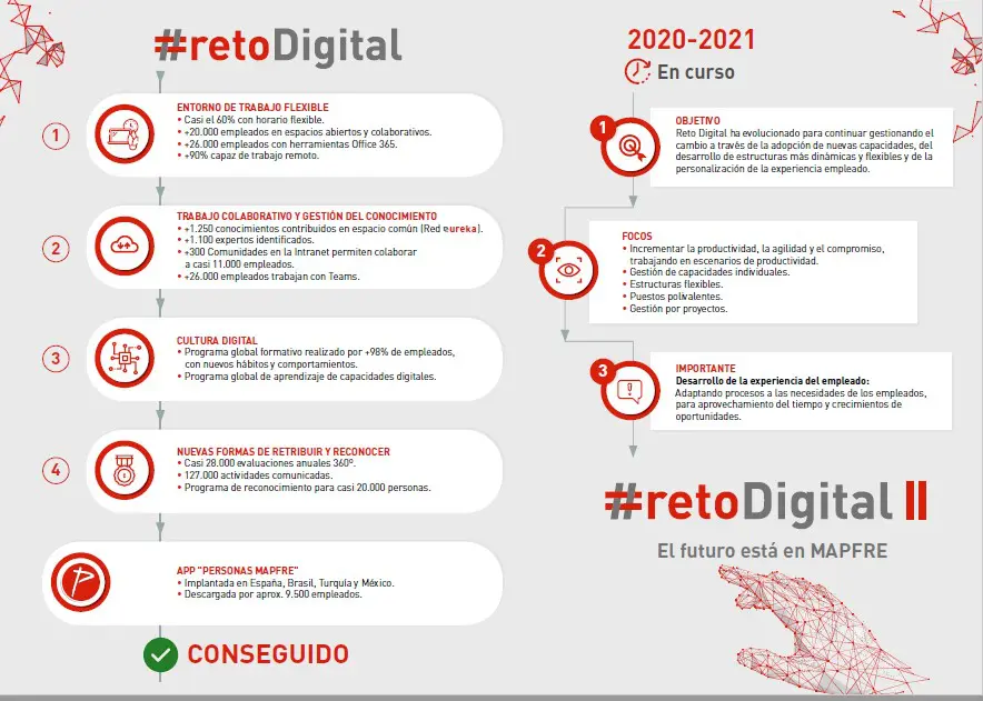Ya en 2018, Mapfre lanzó Reto Digital para gestionar el cambio de la organización hacia un entorno de trabajo adaptado a la era digital ganando flexibilidad y agilidad, trabajo colaborativo y puesta en común de conocimiento, cultura digital y nuevas formas de retribuir y reconocer. A principios del año 2000, la compañía evolucionó el desafío (Reto Digital II) para continuar gestionando el cambio a través de la adopción de nuevas capacidades, estructuras más dinámicas y flexibles y una personalización de la experiencia empleado.