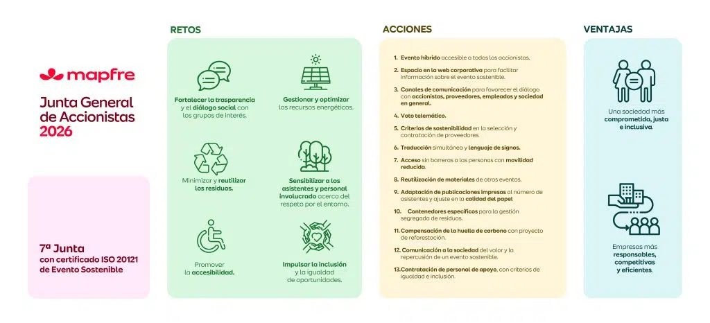 En Mapfre podemos presumir de ser de las primeras empresas del IBEX 35 en tomarse muy en serio la puesta en marcha de una Junta General de Accionistas de estas características, superándonos en cada edición. Y por eso la semana pasada conseguimos superar los retos que nos habíamos puesto: fortalecer la transparencia y el diálogo social con los grupos de interés; gestionar y optimizar los recursos energéticos; minimizar y reutilizar residuos; sensibilizar tanto a los asistentes como al personal involucrado; impulsar la inclusión y la igualdad; y promover la accesibilidad.