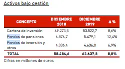 Mapfre gestiona activos en 26 países y el año pasado logró rebasar todos los récords. Más allá de la cartera de inversión del grupo asegurador, que alcanza casi los 54.000 millones, el ahorro gestionado de los clientes a través de planes de pensiones y en fondos de inversión ha superado una barrera histórica. En concreto, asciende a 5.471,9 millones en el caso de los planes a cierre de 2019, lo que supone un fuerte incremento del 12,4% frente al ejercicio previo, y a 4.636 millones en fondos, un 6,9% más, según se recoge en el Informe Financiero que se hizo público este miércoles. En total, el importe conjunto se sitúa en un récord de 10.115 millones. Esta mayor aportación del ahorro gestionado ha contribuido a llevar la cifra total de los activos bajo gestión del grupo, también en cifras nunca vistas. Si a estos datos de planes y fondos se suma la cartera de inversión del grupo, la cifra alcanza 63.638 millones de euros, lo que supone un aumento del 8,8% respecto al ejercicio previo.