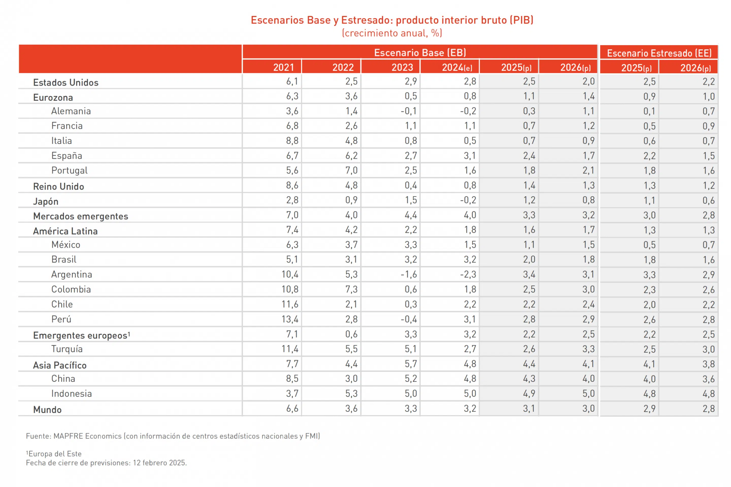 Mapfre Economics, el Servicio de Estudios de Mapfre, ha vuelto a mejorar la previsión de crecimiento para la economía mundial hasta alcanzar el 3,1% este año, una décima más, y el 3% el que viene, según el informe ‘Panorama económico y sectorial 2025’, editado por Fundación Mapfre. La inflación, por su parte, será del 3,5% este año y del 3% el que viene.