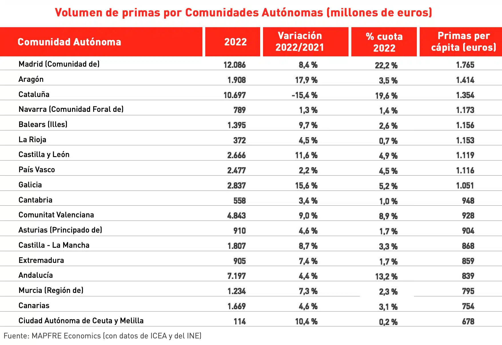 El Grupo Mapfre continúa siendo el principal grupo asegurador español a nivel global, con un incremento del 10,8% en el volumen de primas totales en 2022, superando los 24.540 millones de euros de seguro directo y reaseguro aceptado (el 70% de las cuales se ubican fuera de España). Este incremento de primas refleja una mejora generalizada del negocio asegurador en prácticamente todas las regiones, con incrementos significativos en Latinoamérica y Norteamérica, así como en los negocios reasegurador y de grandes riesgos y el favorable comportamiento de casi todas las monedas frente al euro.