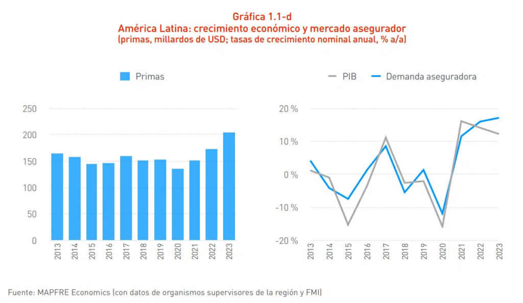 El sector asegurador latinoamericano “se comportó de forma muy positiva” en 2023, apunta el estudio de Mapfre Economics, pese al moderado crecimiento económico de la región (2,2% de avance del PIB frente al 4% del año anterior). Tanto Vida como No Vida crecieron al mismo ritmo, el 17,1%.