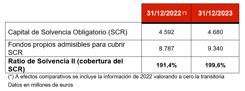El ratio de Solvencia II de Mapfre S.A. se situó en el 199,6% a 31 de diciembre de 2023. En caso de aplicar la medida transitoria, se produciría un aumento de los fondos propios admisibles de 403,3 millones de euros y un aumento del ratio de solvencia de 8,6 puntos porcentuales, pasando el ratio de 199,6% al 208,2% a diciembre de 2023.