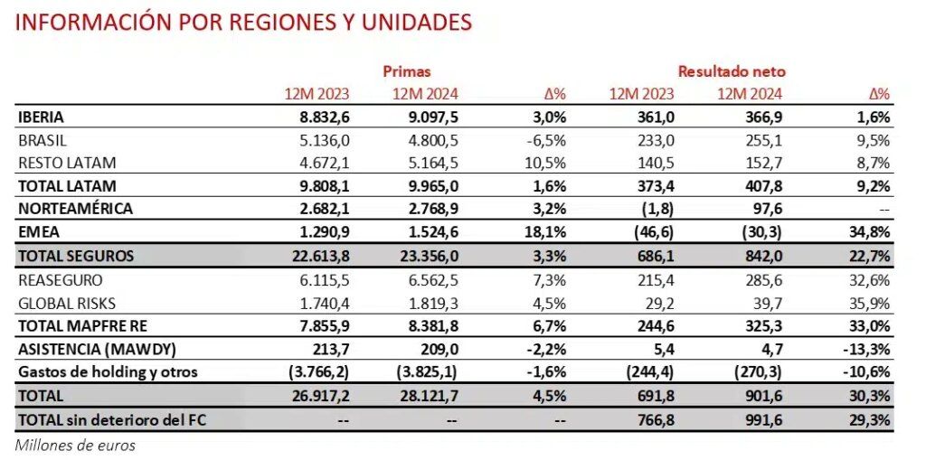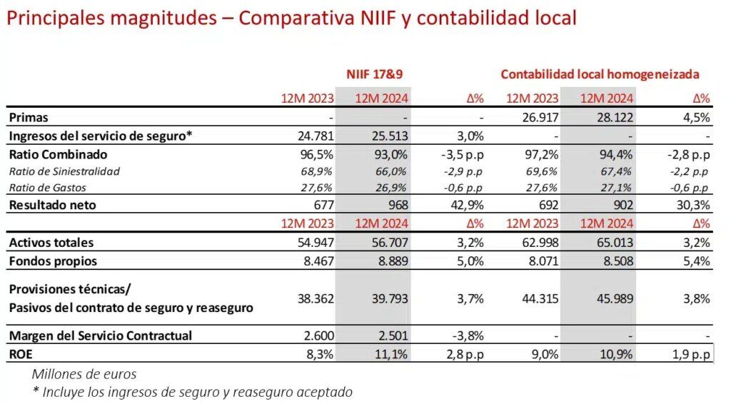 Mapfre S.A. advierte que, salvo indicación contraria, las cifras y ratios que contiene este informe de actividad están presentadas bajo los principios contables vigentes en cada país, homogenizados para permitir la comparación y agregación entre unidades y regiones. Para ello se han aplicado ciertos ajustes, siendo los más relevantes los siguientes: la eliminación de la amortización de Fondo de Comercio en España y la eliminación de las reservas catastróficas en algunos países de Latinoamérica. En Malta y Portugal la contabilidad local aplica las NIIF 17 & 9. Pueden consultar las definiciones y métodos de cálculo de medidas financieras utilizadas en el presente informe bajo las NIIF 17&9 en el siguiente enlace: https://www.mapfre.com/media/2025/10/2024-12-medidas-alternativas-rendimiento.pdf