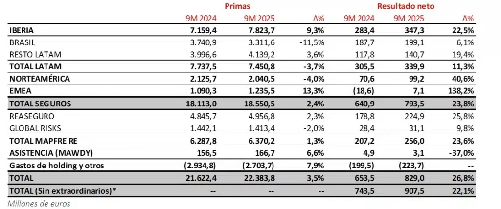 - Las primas en IBERIA ascienden a 7.824 millones (+9,3%), de los cuales España contribuye con 7.508 millones (+10,0%). En Portugal, las primas alcanzan los 316 millones.