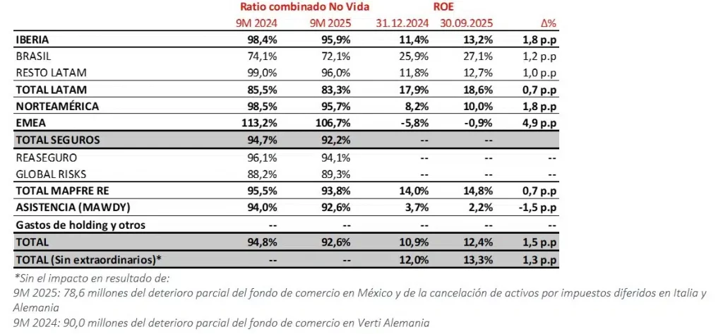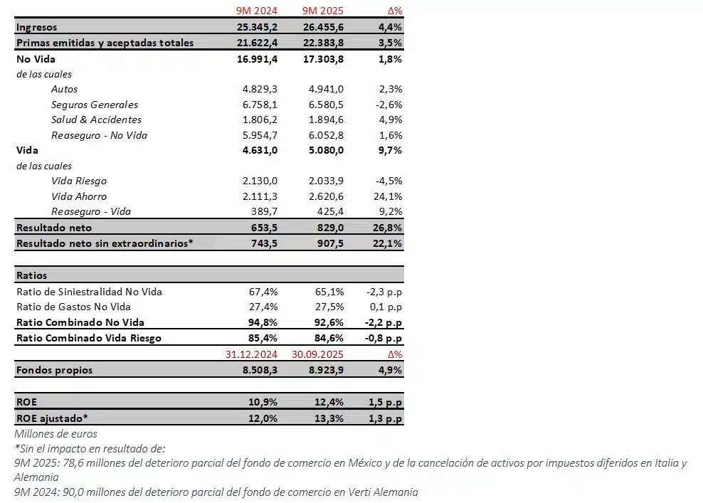- Turquía y Malta siguen aportando positivamente, mientras Alemania e Italia reducen significativamente las pérdidas, mejorando el ratio combinado de la región hasta el 106,7% (desde el 113,2% en 9M 2024) y el resultado hasta los 7 millones (-19 millones en 9M 2024).