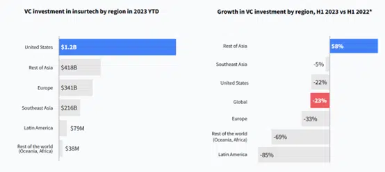En el análisis por geografía, Estados Unidos es la región que lidera la inversión en insurtech en 2023, con 1,2 mil millones de dólares hasta la fecha. Si observamos los territorios con mayor crecimiento, Asia es el que lidera el ranking, con un 58% de crecimiento en el primer semestre de 2023 con respecto al mismo periodo de 2022.