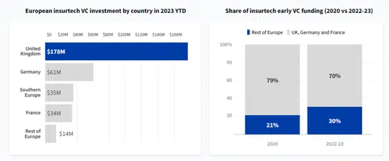 Figura 3: Inversión por país en Europa en 2023 (izq.) y porcentaje de financiación temprana en insurtech (dcha.). Fuente: Dealroom.co. Cierre de datos a fecha de 12 de junio de 2023