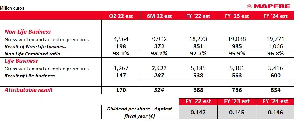 This consensus has been prepared based on the most recent estimates received from the research analysts covering MAPFRE, and it represents solely the views and opinions of said analysts. MAPFRE has not verified any of the information it has received and none of MAPFRE, its affiliates or their respective directors, officers and employees make any representation or warranty, express or implied, as to, or accept any responsibility for, the accuracy or completeness of the consensus information or otherwise endorse or concur with any of the consensus information. MAPFRE does not undertake any responsibility to update, revise or supplement periodically the content of this document, which is provided for informational purposes only and is not intended to constitute, nor can it be interpreted as, an offer or an invitation to sell, exchange or buy, and it is not binding on MAPFRE in any way.