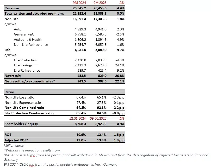 - Turkey and Malta continue to contribute positively, while Germany and Italy significantly reduce losses, improving the combined ratio to 106.7% (from 113.2% in 9M 2024) and the result to €7 million (-€19 million in 9M 2024).