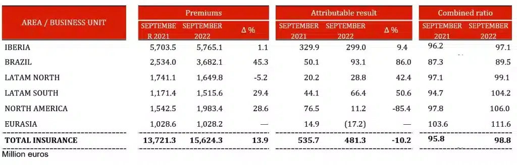 - In the North America Regional Area, premiums increased by 28.6% to 1.98 billion euros, with marked growth in the Automobile (+16.8%) and Property & Casualty (+15.9%) lines. Earnings stood at 11.2 million euros (-85.4%), significantly impacted by the Automobile loss ratio and the cost of Hurricane Fiona, which affected Puerto Rico in the amount of 22 million euros.