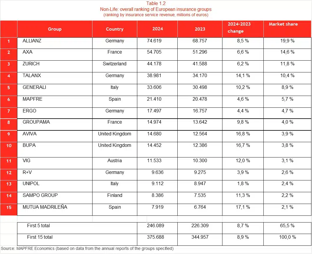 In the Non-Life segment, these 15 groups (including Allianz, Axa, and Zurich in the top three, and Mapfre holding steady in sixth position) generated 375.7 billion euros in insurance service revenue in 2024, marking an 8.9% year-on-year increase.
