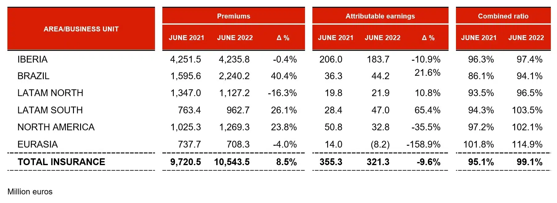 In the LATAM North Regional Area, premiums amounted to 1.18 billion euros (-16.3%). This decrease is accounted for by the issuing of a two-year policy in Mexico for 469 million euros in June 2021. Excluding the effect of this policy, growth in this regional area would be 28.4 percent, driven in part by the improvement in all currency exchange rates in the region and the General P&C and Health and Accident insurance businesses.