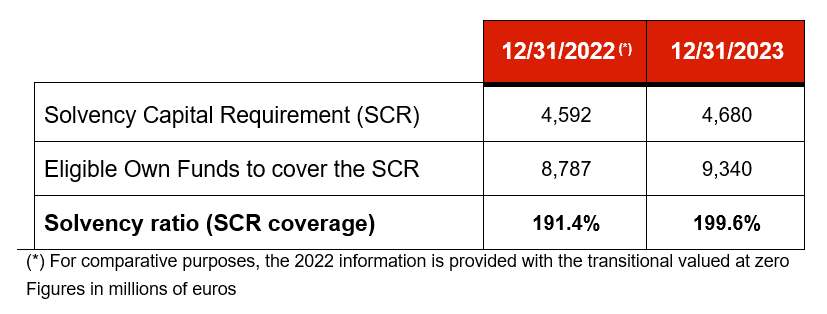 Mapfre S.A.’s Solvency II ratio stood at 199.6% at December 31, 2023. If the transitional measure were applied, it would lead to a 403.3 million euro increase in eligible own funds and an 8.6 percentage point increase in the solvency ratio, from 199.6% to 208.2% at December 2023.