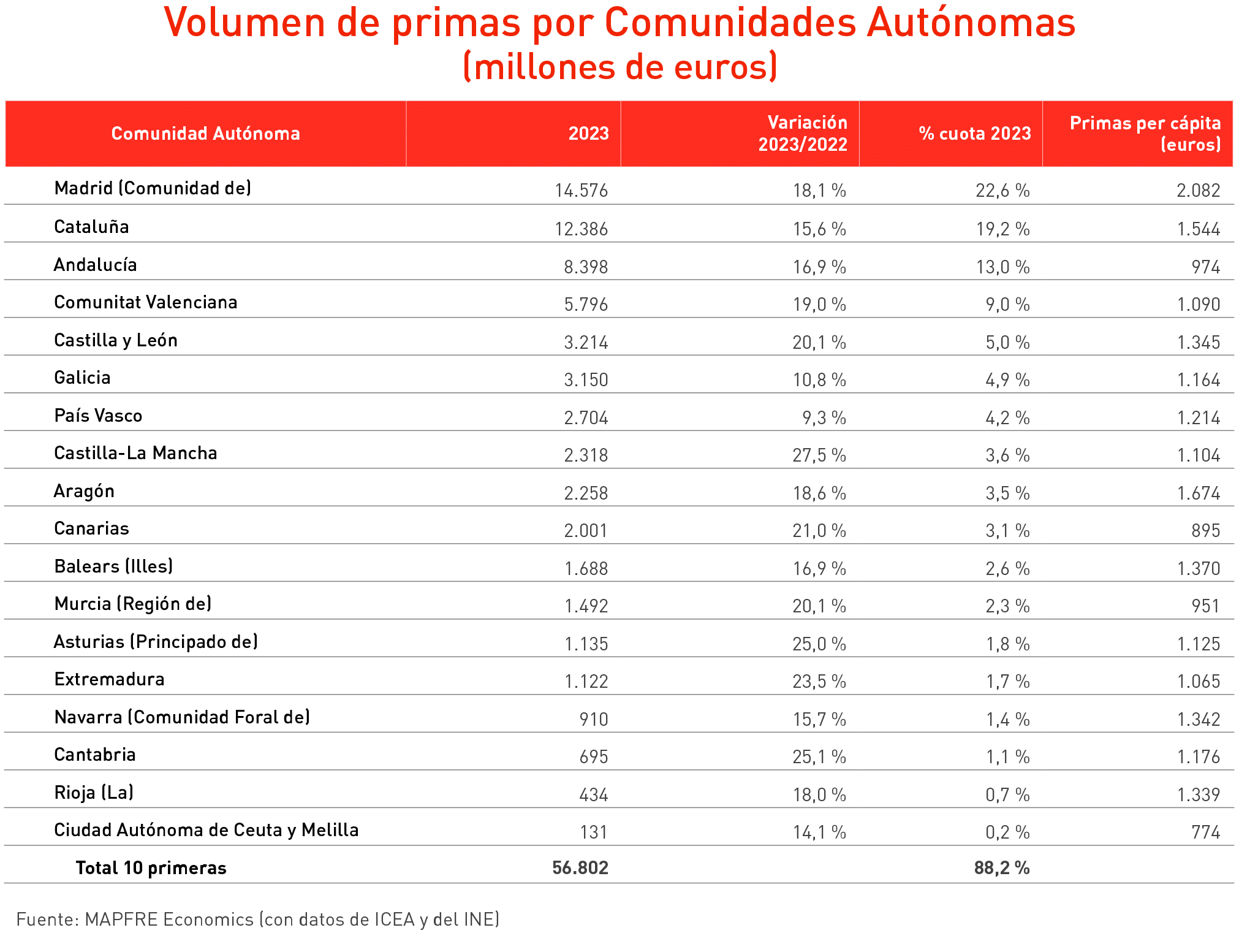 All the autonomous communities saw double-digit premium growth, except for the Basque Country, which grew by 9.3%. The growth in Castilla-La Mancha was particularly noteworthy with 27.5%, followed by Cantabria with 25.1%, and Asturias with 25%.