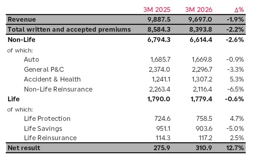 - Non‑Life premiums increase 1.0%, with good performance in Autos (+2.3%) and Accident & Health (+3.8%). General P&C declines (-3.9%) due to the extraordinary issuance in Commercial lines in the first quarter of 2025.