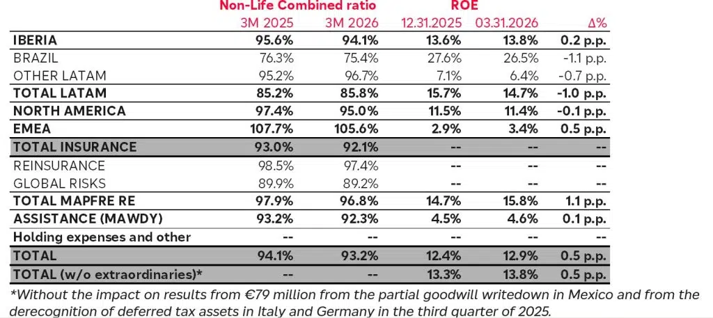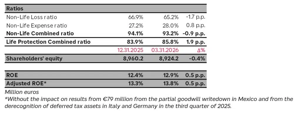 - The Non‑Life combined ratio improves to 95.0% (‑2.4 p.p.) driven by the technical measures and tariff adjustments applied in recent years. In this context, the Auto and the General P&C combined ratios reach 95.6% (‑1.2 p.p.) and 89.2% (‑10.9 p.p.), respectively, despite the winter weather.
