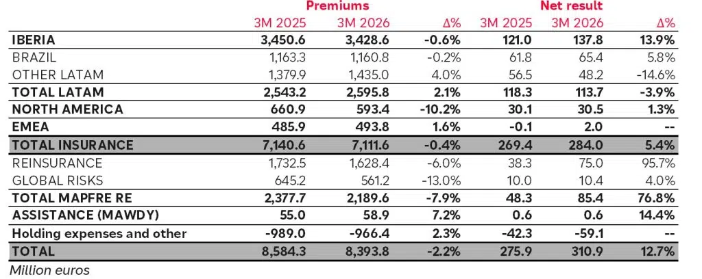- Life premiums fall 0.6% in euros, (-0.4% at constant exchange rates). Life Protection posts solid growth (+4.7%), both in Other Latam, especially Mexico, and in Iberia. The Life Savings business declines 5.0%, after an exceptional first quarter in 2025.
