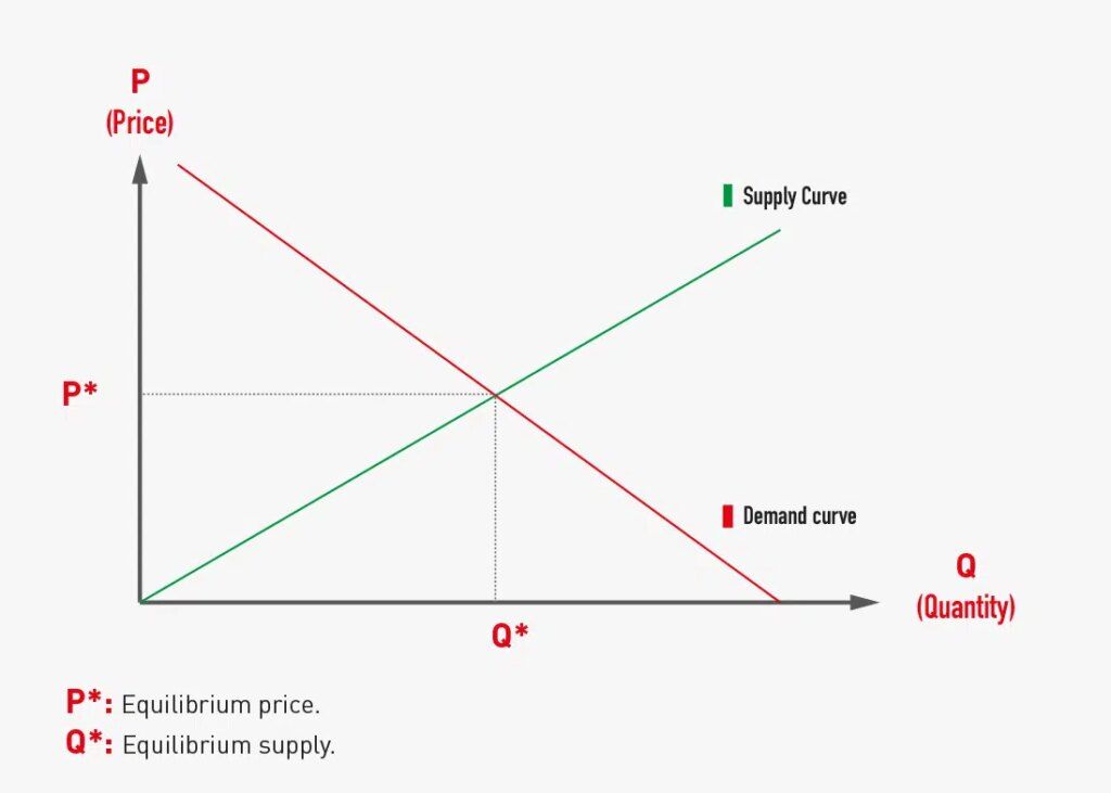 The point of intersection between supply and demand is called price equilibrium – a particular good or service will be delivered to the market (Q*) at a particular price (P*). From that initial point of equilibrium, there are four possible scenarios:
