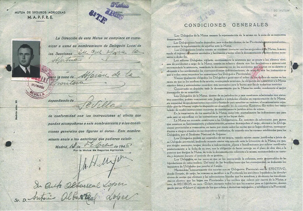 In order to learn about the beginning of Mapfre’s activity in this town, we need to go back to 1946. It was on February 13 of that year when Antonio Albarreal began his professional career as a Mapfre representative in Morón de la Frontera. Logically, at that time, the first insurance policies being marketed were related to the agricultural world: crop insurance or insurance for machinery—as scarce as it was—to work in the fields. The market share of this office in Morón de la Frontera became unbeatable (it insured all the crops in the municipality).