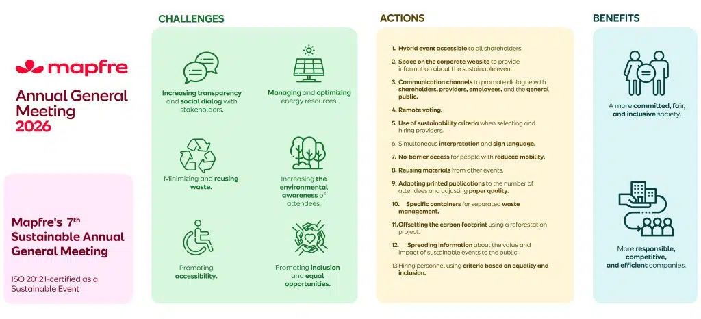 At Mapfre, we’re proud to be among the first IBEX 35 companies to seriously bring such a strong sustainability focus to our Annual General Meeting—and we’ve raised the bar every year since. That’s why we were able to meet our goals last week: strengthening transparency and social dialogue with stakeholders; managing and optimizing energy resources; minimizing and reusing waste; raising awareness among attendees and staff; promoting inclusion and equality; and ensuring accessibility.