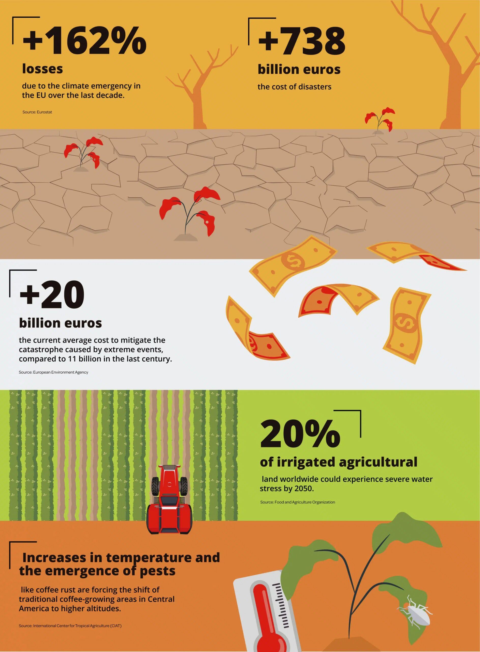 The countryside—an engine of food security and a pillar of many local economies—is on the front line of exposure. In countries such as Spain, Italy, Argentina, India, and the United States, the effects of climate change are already translating into direct losses for agricultural and livestock producers. A report from the World Meteorological Organization (WMO) confirms that global warming broke all records in 2024 and warns that its effects will be irreversible for centuries. This will impact large industrial productions, but also small and medium-sized producers, who often have limited recovery capacity.