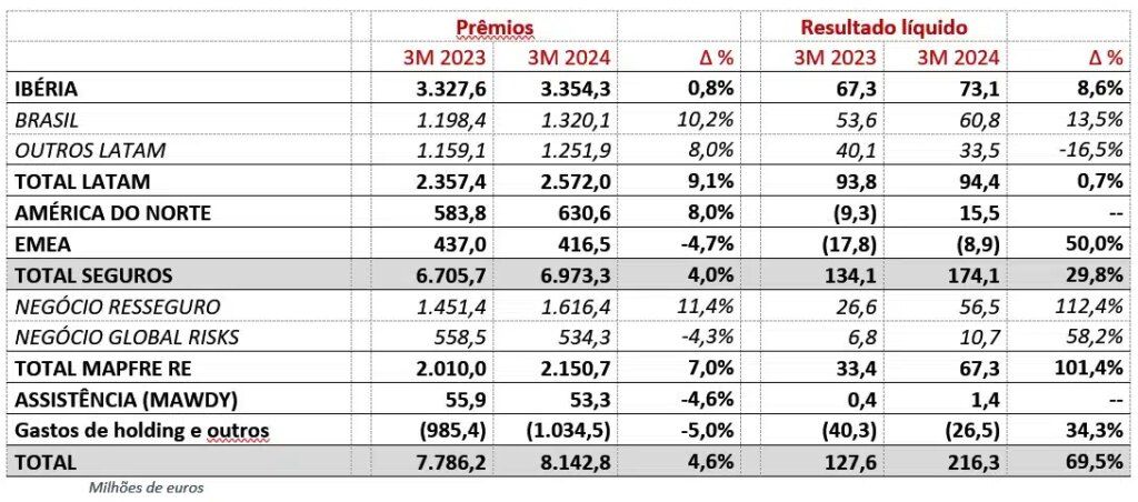 - Os prêmios da Mapfre RE, que incluem o negócio de Resseguro e o de Riscos Globais, aumentaram 7% alcançando 2,15 bilhões.