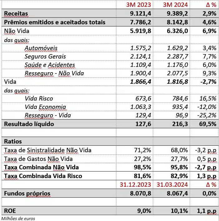 - As receitas, que incluem os prêmios e as receitas por serviços, chegaram 130 milhões, representando um crescimento de 13,5% e registrando um lucro líquido de 1,4 milhões de euros.