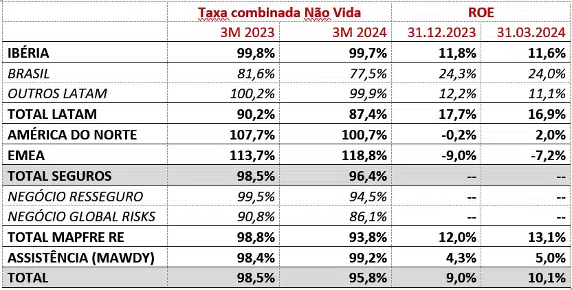 - A melhoria relevante na rentabilidade técnica de Não Vida, com uma redução de quase 3 pontos percentuais do índice combinado, devido tanto a ações técnicas de assinatura e atualização de tarifas, como à ausência de eventos catastróficos relevantes (como em 2023 com o terremoto na Turquia).