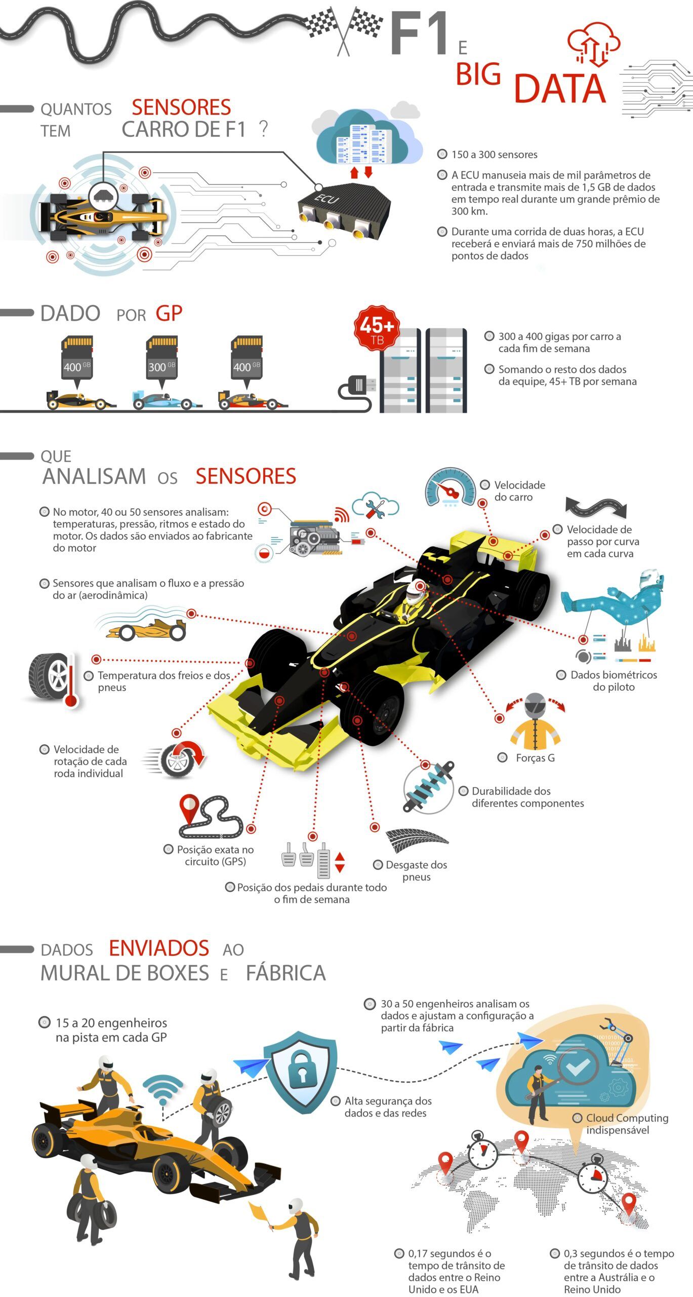 Para termos uma ideia da quantidade de pontos de dados produzidos durante uma corrida de F1, podemos apresentar diversos exemplos. Unicamente no motor de combustão é possível contar entre 40 e 50 sensores que analisam todos os parâmetros críticos, desde as temperaturas instantâneas, pressão, velocidade de rotação, em rotações por minuto, o estado do motor e muito mais.
