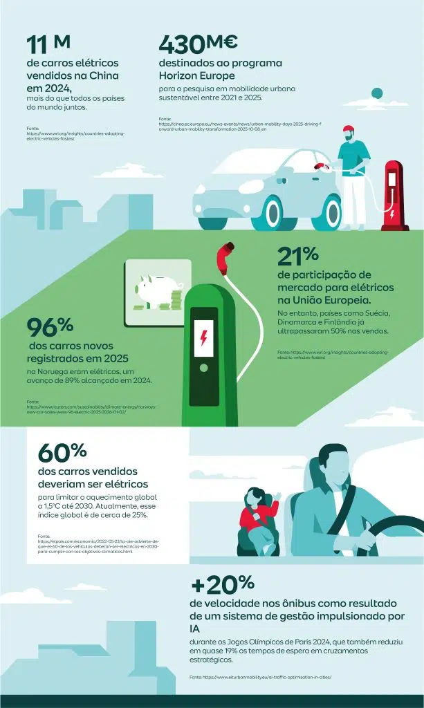 A Europa também mostra progresso, especialmente pelos fundos recordes para a inovação em mobilidade.Entre 2021 e 2025, a UE destinou quase 430 milhões de euros do programa Horizon Europe para a pesquisa em mobilidade urbana sustentável. Estes recursos cobrem desde o planejamento urbano e a logística até a gestão do tráfego e a segurança viária, reforçando o compromisso para tornar as cidades mais limpas. Nesse cenário, países como a Noruega consolidam sua liderança mundial na eletrificação do transporte. Neste país, aproximadamente 96% dos carros novos registrados em 2025 eram elétricos, um avanço de 89% alcançado em 2024. Apenas em dezembro de 2025, as matrículas elétricas norueguesas atingiram 98%, o que praticamente eliminou todos os veículos a combustão dos concessionários. Trata-se de um caso excepcional, pois a União Europeia, como um todo, gira em torno de 21% em energia elétrica; contudo, países como Suécia, Dinamarca e Finlândia já ultrapassaram 50% nas vendas de modelos elétricos.
