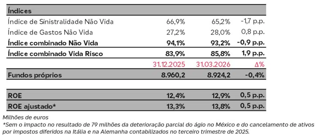 - As rentabilidades da carteira de investimentos contribuíram de forma muito positiva para o resultado financeiro de Não Vida, que aumentou 85,2%. Além disso, foram realizadas mais-valias com um impacto atribuível de 22,4 milhões (frente a 3,9 milhões em 2025).