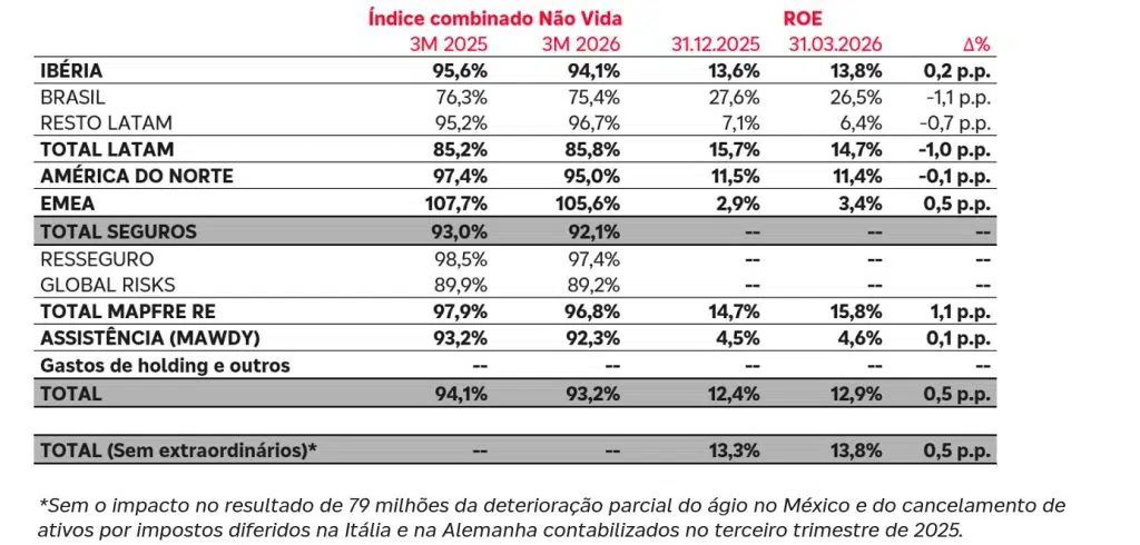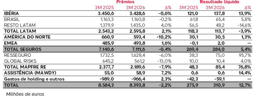 - Os prêmios de Vida caíram 0,6% em euros (-0,4% com taxas de câmbio constantes). Vida Risco registrou um crescimento sólido (+4,7%), tanto no Resto Latam, especialmente no México, quanto na Ibéria. O negócio de Vida Economia caiu 5,0%, após um primeiro trimestre excepcional em 2025.