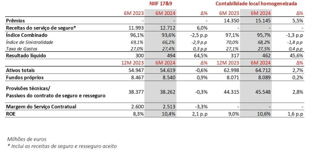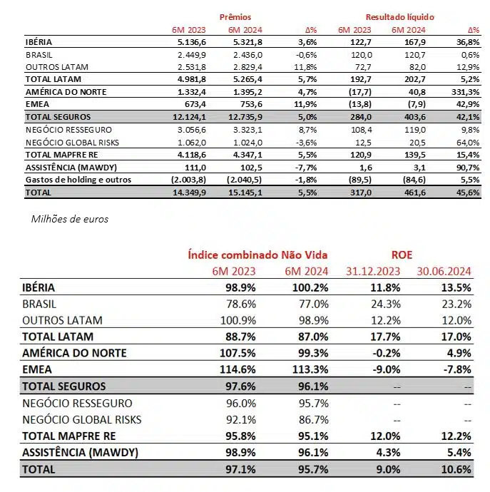 - O índice combinado de Não Vida melhora significativamente até 77,0%, graças a uma redução de 2,5 pontos no índice de Automóveis, que atinge 101,6%, em consequência das atualizações de tarifas já realizadas. O índice combinado de Seguros Gerais apresenta um excelente 68,6%, apoiado no bom comportamento do negócio agrícola, apesar das enchentes na região do Rio Grande do Sul, que teve um impacto líquido no resultado da região inferior a 6 milhões de euros.
