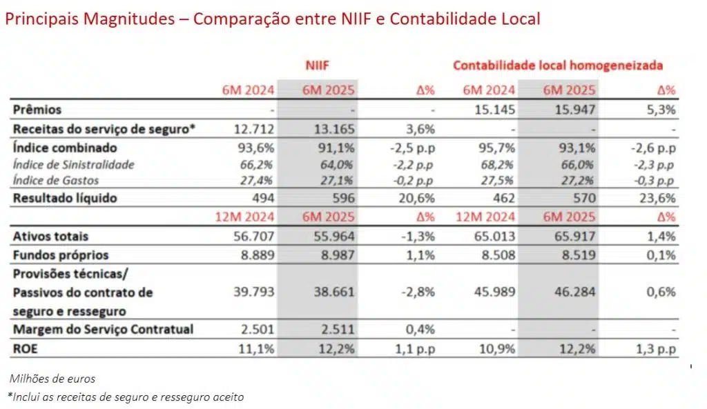 - Os prêmios em IBÉRIA totalizam 6,011 bilhões de euros (+12,9%), dos quais a Espanha contribui com 5,806 bilhões (+14,3%). Em Portugal, os prêmios recuam 15,8%, para 205 milhões, devido à emissão excepcional de produtos de Vida ocorrida em 2024.