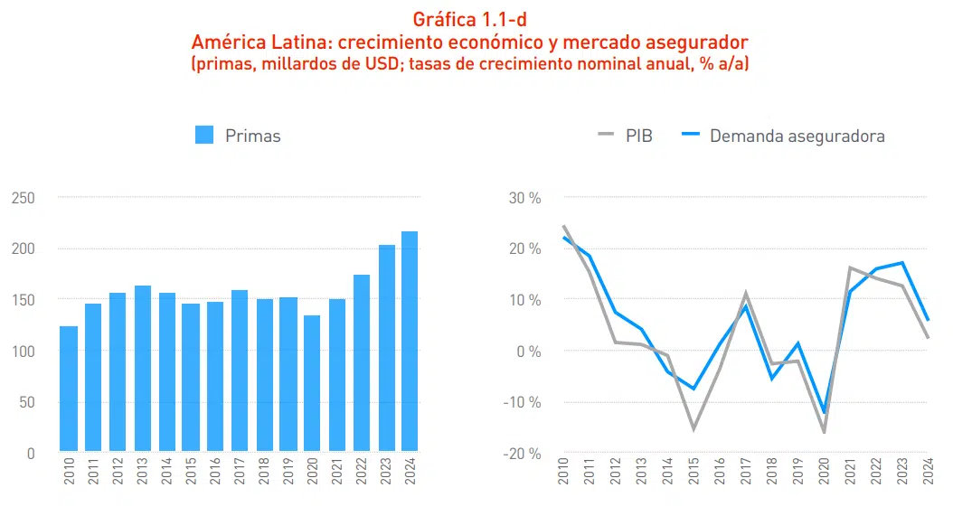 Em 2024, o índice de penetração (relação entre os prêmios e o PIB) dos seguros ficou em 3,2%, 0,1 ponto percentual acima do ano anterior. Este indicador, que mostra o peso dos seguros no total da economia, é especialmente alto em Porto Rico (18,2%), porque inclui os seguros de saúde para a população de baixa renda que são financiados pelo governo. Depois do país caribenho, Chile (4,6%), Uruguai (3,6%), Brasil (3,3%) e Colômbia (3,3%) apresentaram os maiores níveis de penetração do seguro.